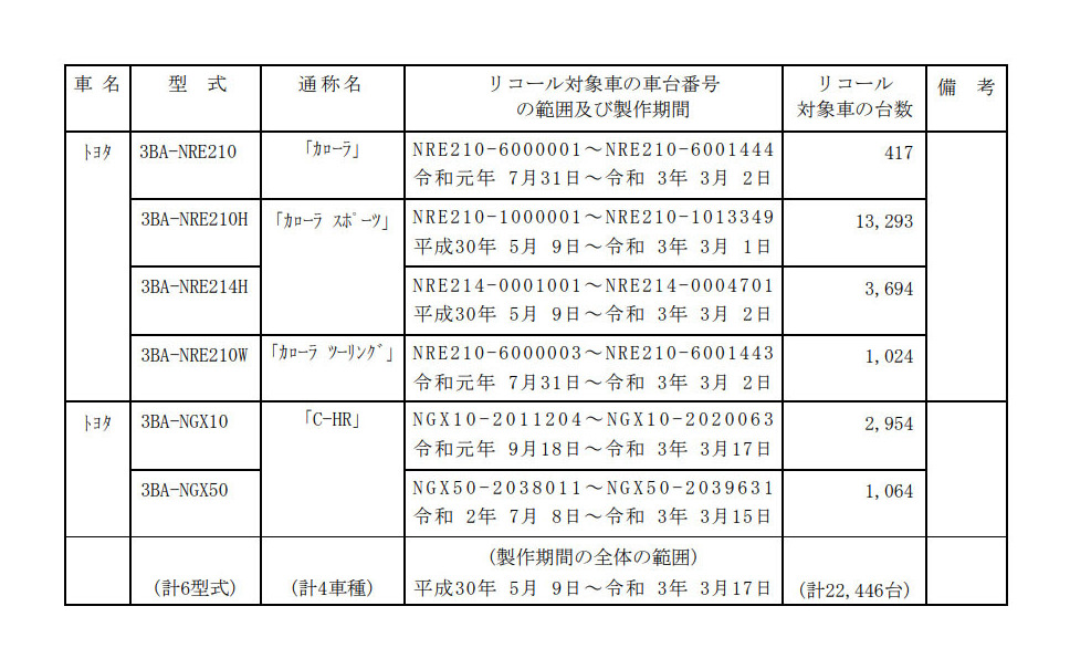 の4車種で、2018年5月9日〜2021年3月17日に製造された2万2446台。